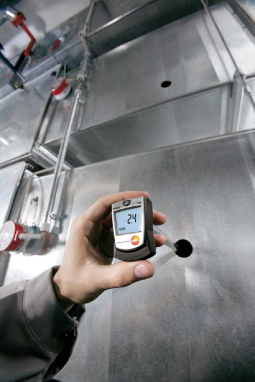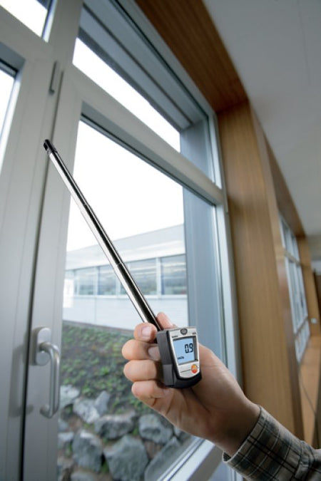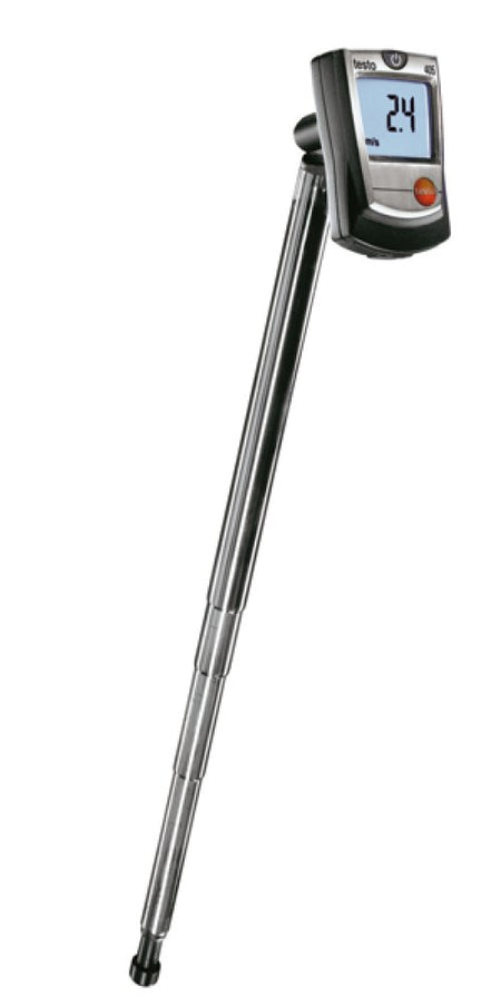 Testo 405 is a thermal anemometer with a telescopic handle (max. extension length: 300 mm). It facilitates the measurement of air flow, volume flow and temperature.