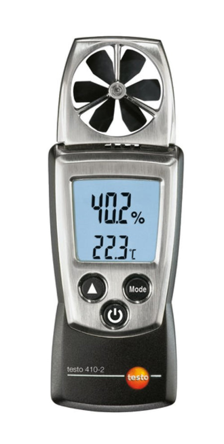 Testo 410-2 is designed for the measurement of air flow velocity, temperature and humidity. Testo's own patented humidity sensor guarantees reliable measurement results. Thanks to the integrated measurement with the 40 mm vane, it is ideally suited for fast spot checks at air vents. A timed mean value calculation is possible. The measuring instrument is very handy, small and easy to operate.