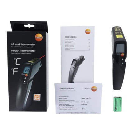 Testo 830-T1 infrared thermometer, including batteries and protocol certificate.