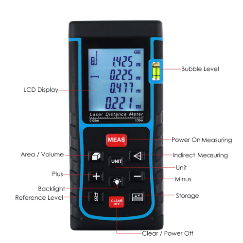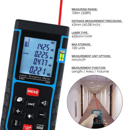 This Professional Distance Meter employs laser technology it has a wide measuring range 100m (328ft) and particularly high accuracy +- 2mm.
