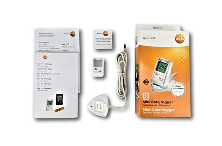 You need a USB interface to programme and read your testo 174T mini data logger for temperature. The USB interface is already included in the scope of delivery when you purchase this set. This means you can start your temperature recording straight away!testo 174T - 1-channel, wall bracket, battery (2 x CR 2032 lithium), calibration protocol. Plus Interface and USB cable.