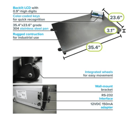 - Weight capacity of 150kg x 0.05g with 500x500mm standard pan size.