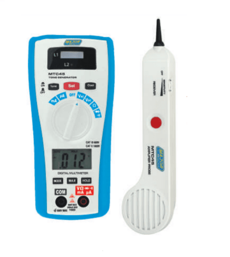The MTC45 is a 2-in-1 Tone and Probe generator as well as an auto ranging multimeter. The meter tests include wire trace, continuity test, clear/busy/ringing, line test and tip/ring identification.