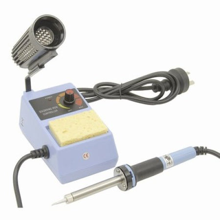 An ideal entry-level soldering station for the hobby user. This station comes with a lightweight iron with anti-slip grip and tip cleaning sponge, with temperature adjustment up to 450°C. It also has a 4mm banana socket connected to mains earth for soldering static-sensitive components.