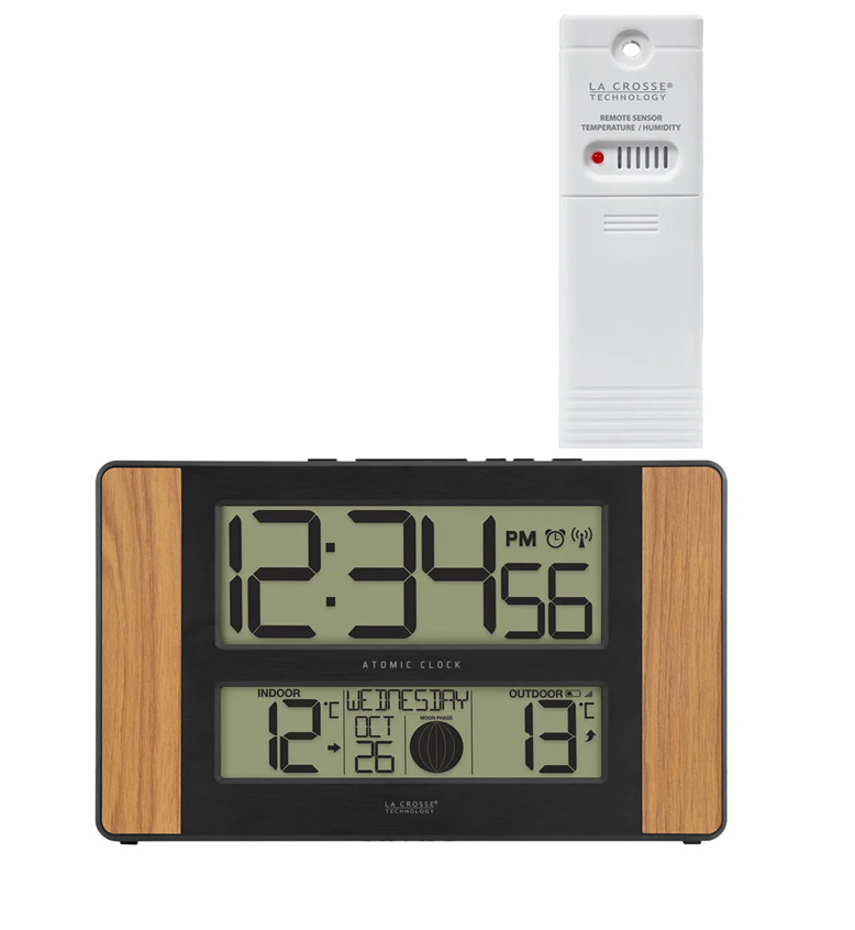 513-1417 Moon Phase Digital Wall Clock Wood Panel with In/Outdoor Temp