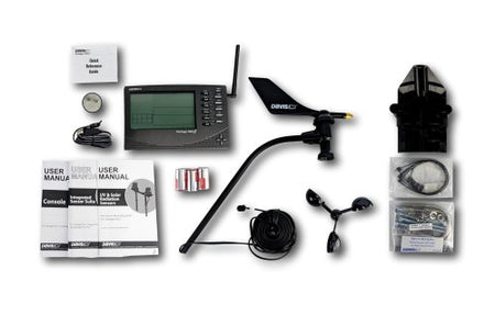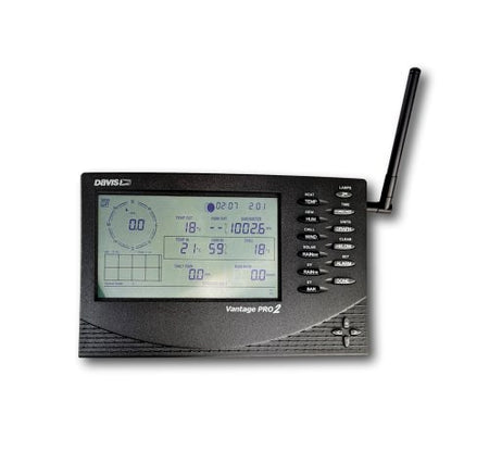 First and only weather station in its class to use frequency hopping spread spectrum radio technology to transmit weather data wirelessly up to 300 m. Includes Vantage Pro2 console/receiver, integrated sensor suite (ISS), and mounting hardware. ISS includes rain collector, temperature and humidity sensors, anemometer, 12 m anemometer cable, solar radiation sensor, UV sensor, sensor mounting shelf, and solar panel.