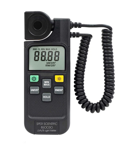 UV light intensity appears on the large backlit display in either uw/cm² or mw/cm² while the small upper display simultaneously shows minimum, maximum, hold and battery status. Measures long and medium wave UV-A/B for applications such as: forensics, chromatography, electrophoresis, dermatology and more.