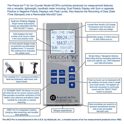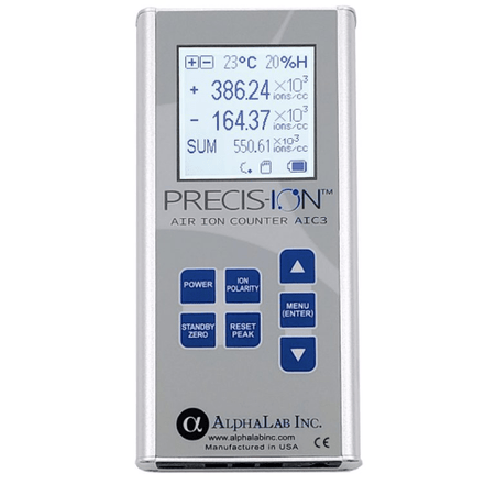 The Precis-Ion Air Ion Counter Model AIC3Pro is a lightweight, handheld Gerdien condenser meter that measures the number of positive or negative air ions. The meter can display both polarities and their sum. It also features a Li battery and data/time stamped data recording via a removable MicroSD card.