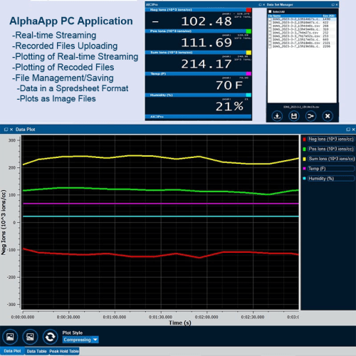 | Data Recording | Date and Time stamped files in a standard CSV format (supported by most data analysis software). Includes Ion Level, temperature, and humidity. In dual polarity mode, both polarities and sum are recorded. Data is recorded onto a removable MicroSD, 32GB max. |