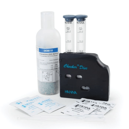 The HI38017 is a chemical test kit that uses N,N Diethyl-1,4 Phenylenediamine Sulfate (DPD) to measure free and total chlorine in the low and medium range. The HI38017 is supplied complete with all of the reagents and equipment necessary to perform 200 tests.