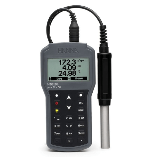 The HI98199 is a rugged, portable multiparameter meter with a single digital probe input that allows it to use either a pH, conductivity or dissolved oxygen probe.