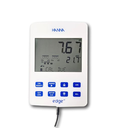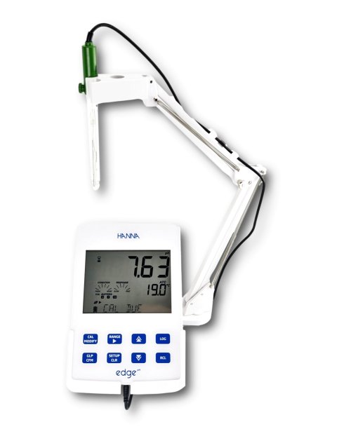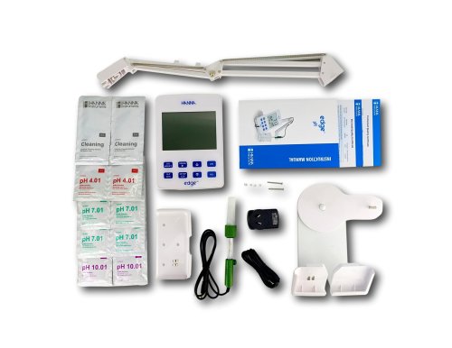 Edge HI2002 digital pH meter includes benchtop docking station with electrode holder, wall mount cradle, USB cable, HI11310 glass body refillable pH electrode with temperature sensor, 2 sachets each of pH 4, 7, 10, cleaning solution, 5 VDC power adapter and instruction manual.