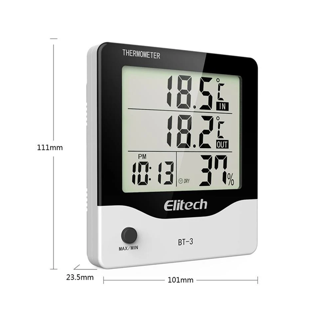 Elitech BT-3 LCD Indoor/Outdoor HVAC Digital Hygrometer Thermometer with Clock and Min/Max Value
