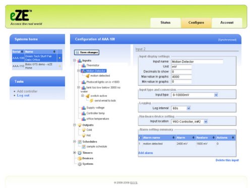 The eZEio can be configured to send emails, text messages, or even call your phone if the sensor input goes exceed limits you define. Up to four different thresholds can be set up for every sensor.