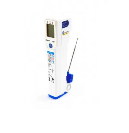 Dual food thermometer that can function either as an infrared or probe thermometer.