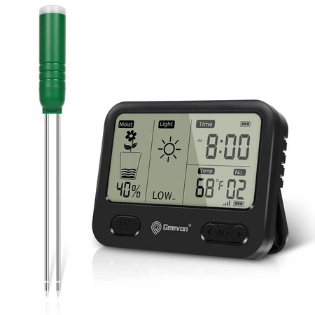 The Geevon WS0302 is a plant soil moisture meter designed to measure soil moisture content, temperature, and sunlight for indoor and outdoor plants.