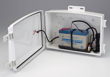 Includes the new 5.0-watt-solar panel, weather-resistant shelter, regulator circuit, 12-amp 6-volt rechargeable battery and 3 m cable.