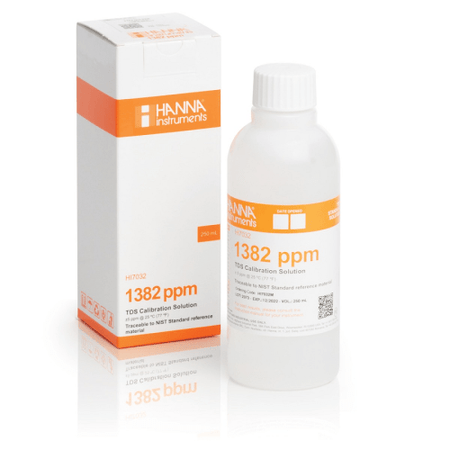 HI7032M is a premium quality 1,382 mg/L (ppm) TDS calibration solution that is prepared against a NIST traceable potassium chloride solution. Hanna TDS solutions have the lot number and expiration date clearly marked on the label and are air tight with a tamper-proof seal to ensure the quality of the solution. Hanna’s line of TDS standards have been specially formulated to have an expiration of 5 years from the date of manufacture for an unopened bottle.