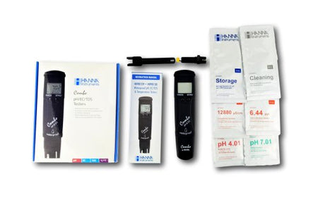 HI 98130 is a waterproof tester that offers high accuracy pH, EC/TDS and temperature measurements in a single tester! No more switching between meters for your routine measurements. This floating, waterproof combination tester has an easy to read, LCD and an automatic shut-off. pH and EC/TDS readings are automatically temperature compensated.