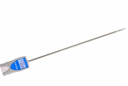 Moisture meter for measuring hay and straw, with very stable, fix mounted insertion probe of 0.6 meters length made of stainless steel. With calibration function for special materials like cellulose, tobacco, alfalfa etc.