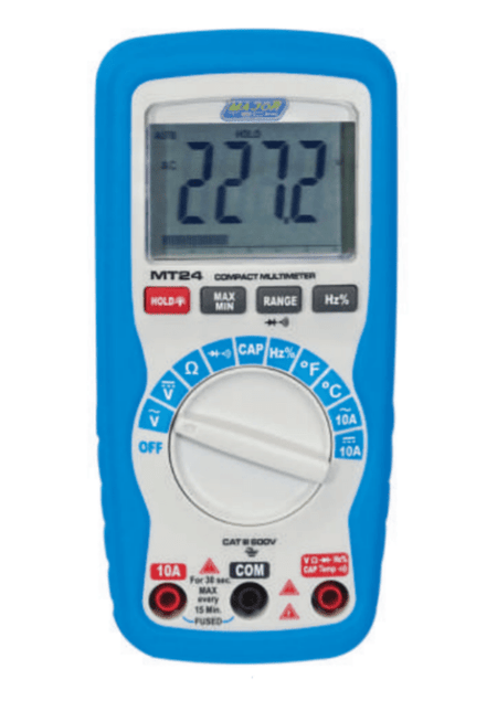 The MT24 is a compact, robust, meter with double moulded rubber housing and meets the International Standard IEC-61010-1 CAT lll 600V.
