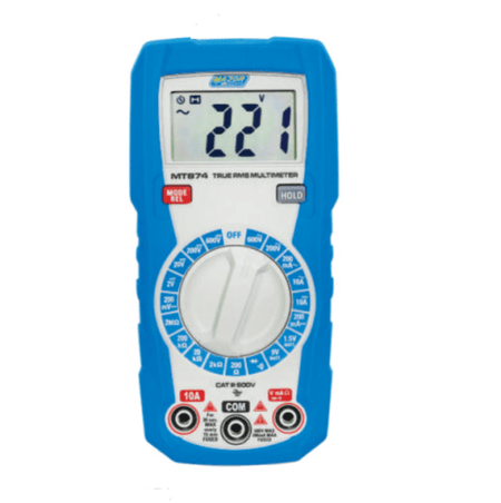 The MT874 is a True RMS multimeter that measures AC and DC voltage up to 600V and AC and DC current up to 10A.