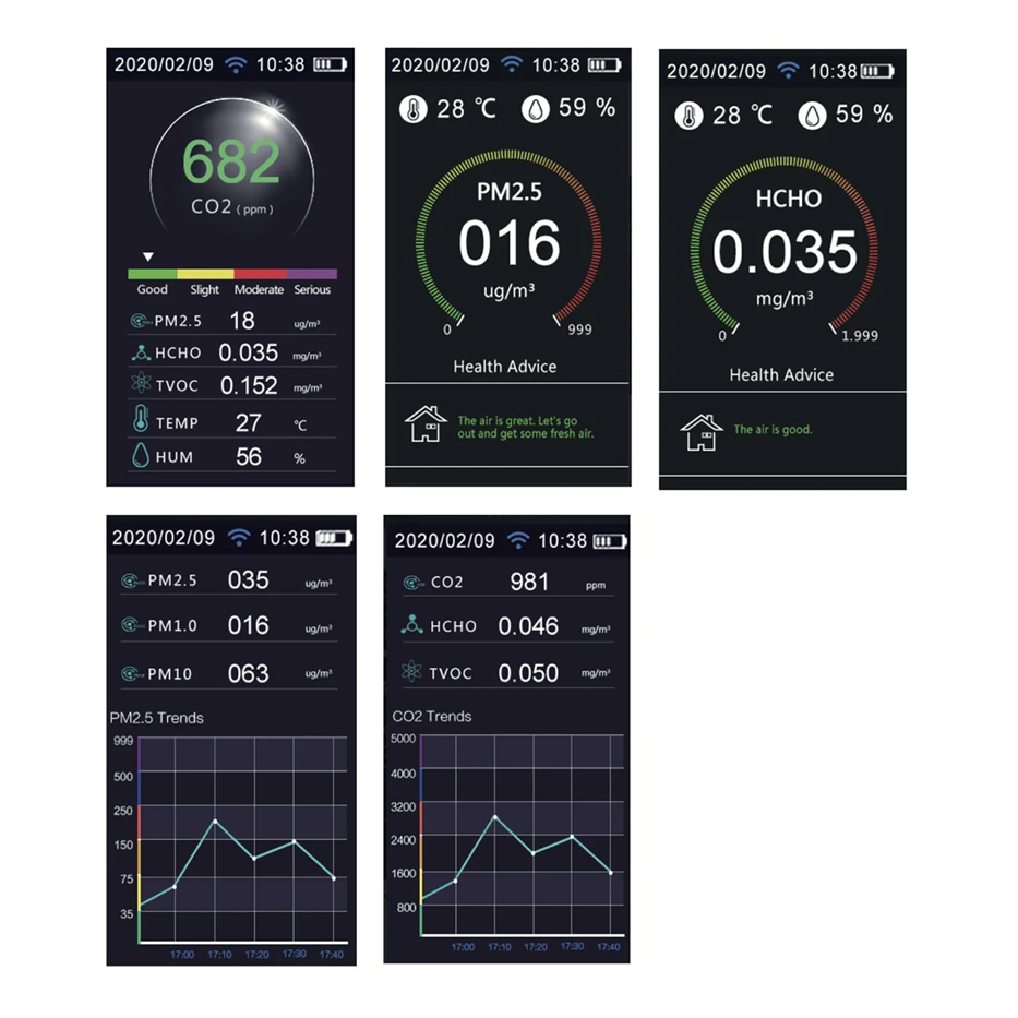 - Measures: CO2, PM2.5, PM1.0, PM10, Time HCHO (Formaldehyde)