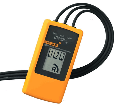 The Fluke 9040 is effective for measuring phase rotation in all areas where three phase supplies are used to feed motors, drives and electrical systems. The Fluke 9040 is a rotary field indicator and can provide clear indication of the 3 phase via an LCD display and the phase rotation direction to determine correct connections. It allows rapid determination of phase sequence and has a voltage (up to 700 V) and frequency range suitable for commercial and industrial applications. The included test probes have a variable clamping range for safe contact, also in industrial sockets.