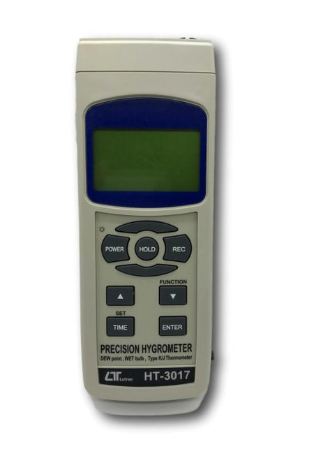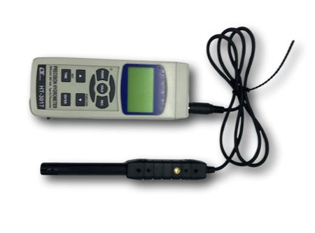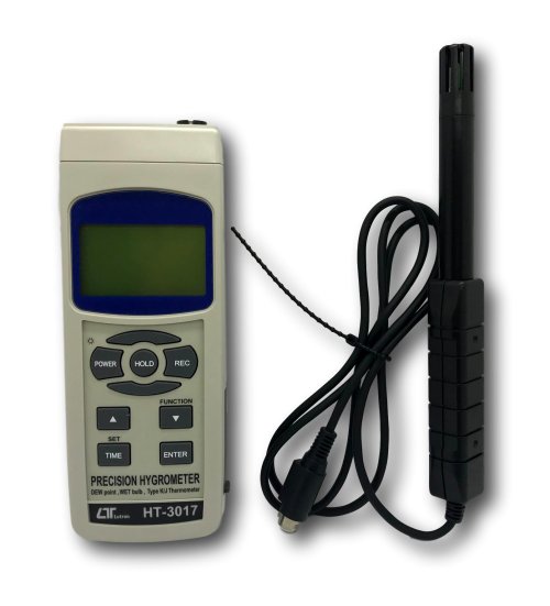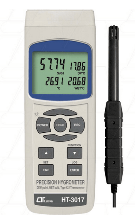 - Measures humidity (%RH), wet bulb, dew point temperature, and temperature simultaneously.