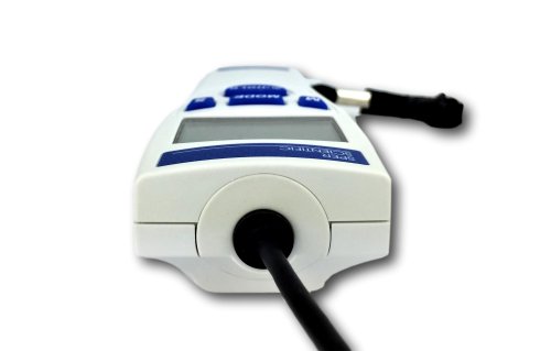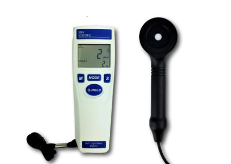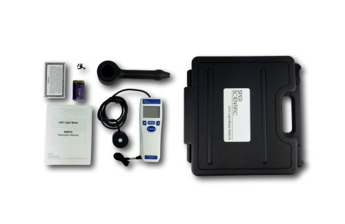 UV light intensity appears on the large backlit display in either microwatts (uW) or milliwatt/square centimeter (mW/cm2) while the small lower display simultaneously shows minimum, maximum, average and recorded data. Up to 20 data points can be recorded automatically at a variety of intervals. Features zero point reset, hold, and indicates when the battery is low. Comes in a protective hard foam lined carrying case complete with a UV probe, tripod screw, magnetic mount and a 9V battery.
