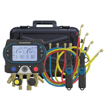 The Sauermann Si-RM450 MANIFOLD KIT 4 (28165) Kit is built around the Si-RM450 manifold and the Si-RT7 wireless temperature clamps.