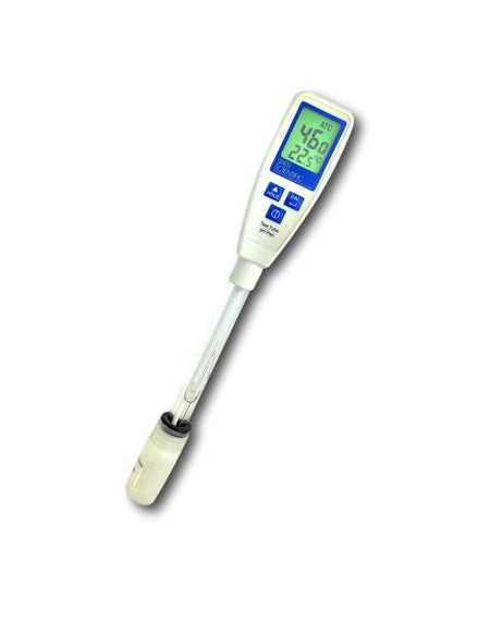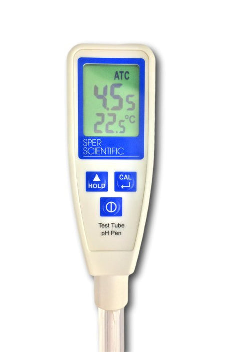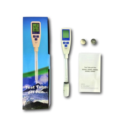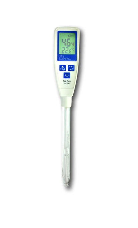 Test Tube pH pen meter with glass probe. EPA compliant for laboratory use and wine samples. Highly stable and accurate readings with a large LCD display. Designed for simple one-hand operation. Automatically calibrates to pH 4, 7 and 10 buffers and can be adjusted to recognize some other non-standard buffers as well.