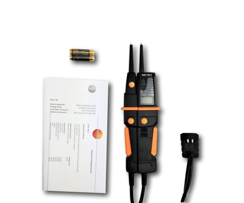 Testo 750-3 voltage tester, including batteries, measuring tip protector and measuring tip caps.