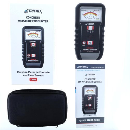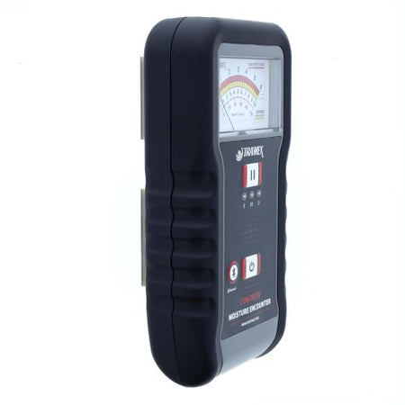 The Concrete Moisture Encounter detects and evaluates the moisture conditions within the slab or screed by non-destructively measuring the electrical impedance. A low frequency electronic signal is transmitted into the material under test via the electrodes in the base of the instrument. The strength of this signal varies in proportion to the amount of moisture present in the material. The Concrete Moisture Encounter determines the strength of the current and converts this to a moisture content value for concrete slabs and a comparative value for other cementitious floor screeds, displayed on a large clear analog dial.
