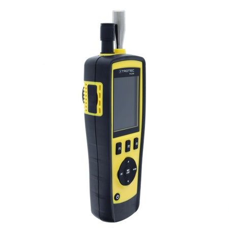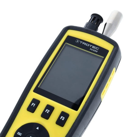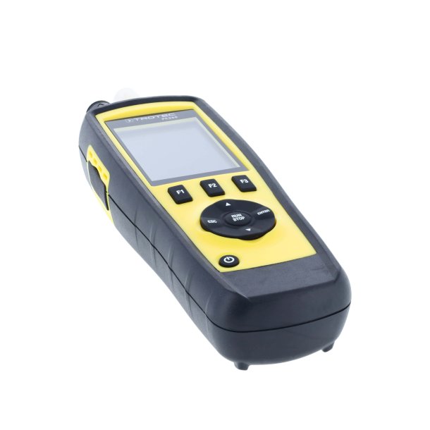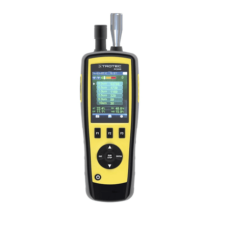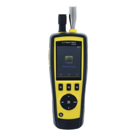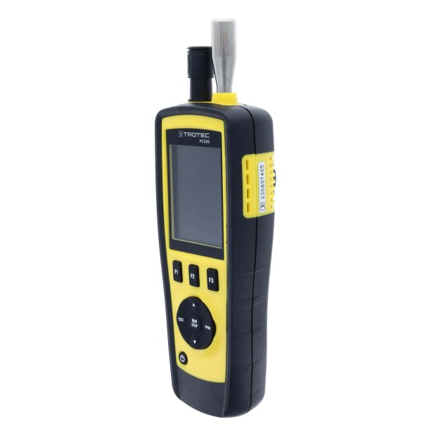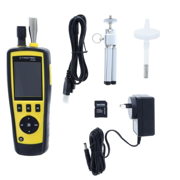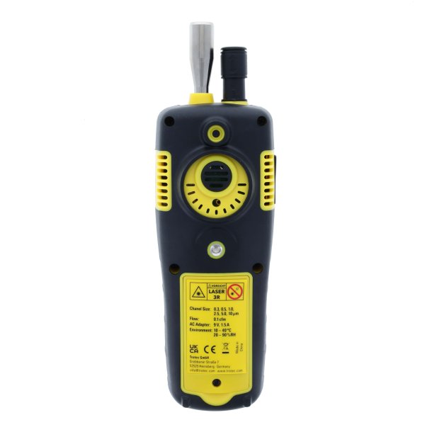 Portable environmental measuring device for testing air quality indoors, for testing the efficiency of HVAC filters, testing of leakages of suspended matter, as well as for testing the technical cleanliness of process engineering.