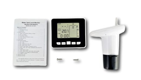 Keep an eye on your outdoor water tank from the comfort of your own living room, up to 100m away. Installed at the top of your water tank, the transmitter unit measures the water level and temperature using an ultrasonic sensor. You can hang the receiver unit on a wall (hooks) or pull out the stand and place it on your kitchen bench top, table or desk. View your room's temperature, tank temperature and water level (represented by a 10 element bar graph). You can store min/max records and set alarms for specific water levels (high/low) or when empty.