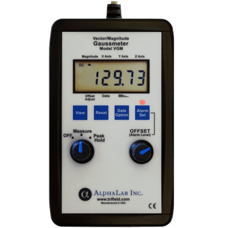 The model VGM is designed for rapid identification and measurement of areas that are magnetized. It is a DC gaussmeter with X,Y and Z sensors at the end of a probe. It displays the magnitude of the field and the X, Y, and Z components, showing both the actual values and the peak values of all the variables. In addition, whenever the field magnitude exceeds a value that you set, an alarm sounds and lights up, and a logic high signal appears at the output jack. The meter is shipped ready-to-use, and includes a 9-volt battery, AC adapter and calibration certificate. This meter is optimized to measure magnetized parts; its range of 799.99 gauss is not high enough to measure the surface of most permanent magnets.