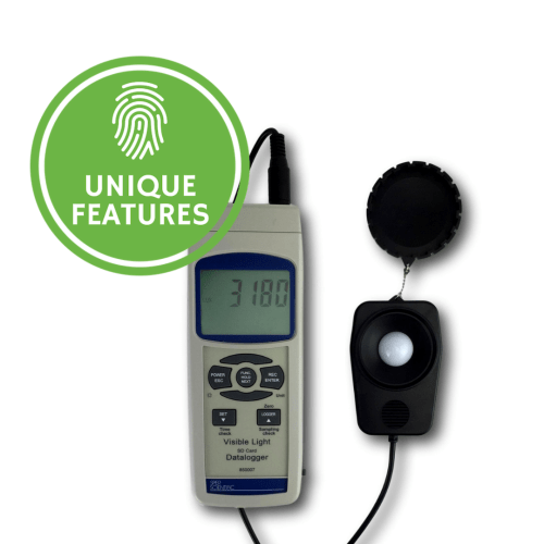 Uploads pre-formatted data to Excel, without the need for additional software and cables. Additional SD cards are readily available in a variety of memory sizes. Can also stream data directly to a computer using the optional software and cables. Each data set includes lux or foot candle reading, time and date. Features push button zero adjustment, min/max, auto power off, low battery indicator and hold function. This well made unit is extremely accurate with fast response times, and includes a back-stand and large, easy-to-read back-lit LCD. Comes ready to use in a soft carrying case complete with a detachable color corrected probe that meets the C.I.E. photopic spectrum, 6 AA batteries, instruction manual and a 2GB SD card.