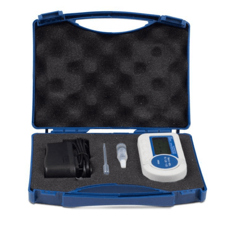 Waterproof digital refractometer for measuring urine specific gravity and serum protein (g/dL).