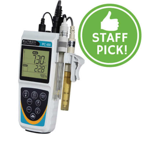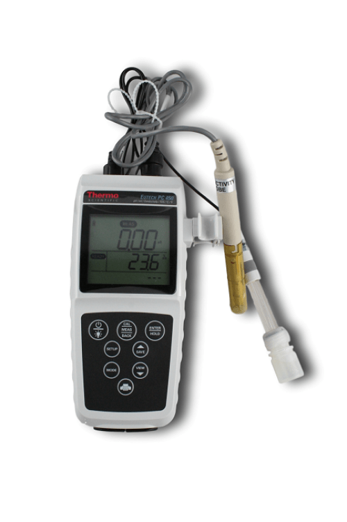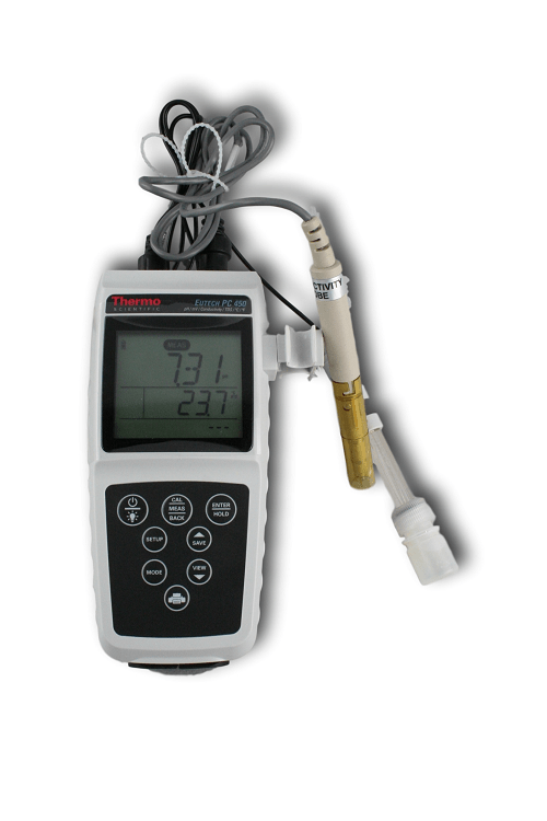 EC-PCWP450-04K - PC 450 Meter Kit: Meter, double-junction pH electrode, conductivity cell (K = 1.0), Grip-Clip, two AA batteries, hard carry case, USB cable, calibration solutions.pH / mV / Conductivity / Total Dissolved Solids / Temperature