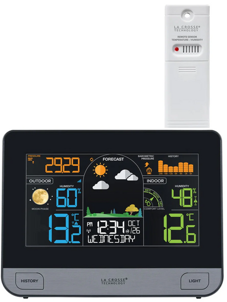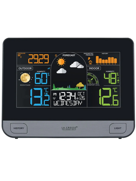 Discover hyper-local weather, personalised for your backyard and beyond, with the S74177 wireless colour Weather Station. It measures indoor and outdoor temperatures, humidity, and barometric pressure, and even displays moon phases. The vibrant color display includes a comfort meter and forecast icons. For those who want to delve deeper, add-on sensors allow you to monitor your entire domain. It's weather as local as it gets—informative, engaging, and yes, even a bit fun.