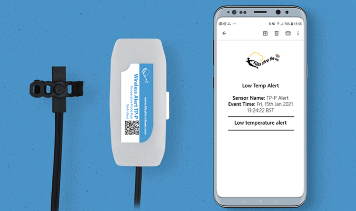 The Wireless Alert TP-P is a battery-powered pipe temperature sensor. It automatically sends a warning email to a user-selected email address when a user-defined temperature is reached.