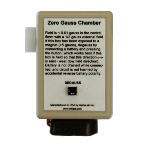 Demagnetizing a zero gauss chamber with an external degausser is difficult, even if a degausser is available. Often an external degausser is not strong enough to erase the magnetism of the inner shield, and using a degausser (which is fairly large) is not convenient. When using the ZGC, a single press of the degauss button brings the internal field to less than 0.01 gauss (in all three axes) within a 5 mm wide x 9.4 mm diameter region in the center of the chamber. While the battery is connected, no power is consumed except when the degauss button is being pressed. Even then, a typical 9 volt battery (included) can power over 10 million degauss cycles. After degaussing, the field is less than 0.01 gauss regardless of the orientation of the chamber (within the Earth field). If the long axis of the chamber (left-right direction in photo below) is specifically oriented east-west during the degauss, the internal field will be less than 0.002 gauss, although most gaussmeters do not require that degree of precision.